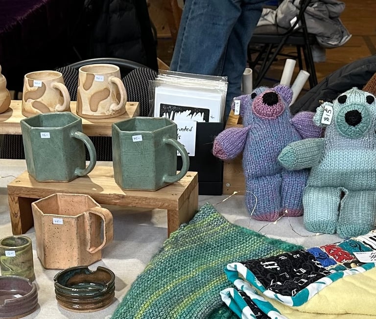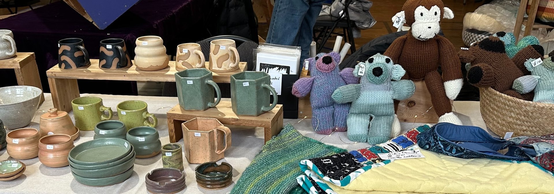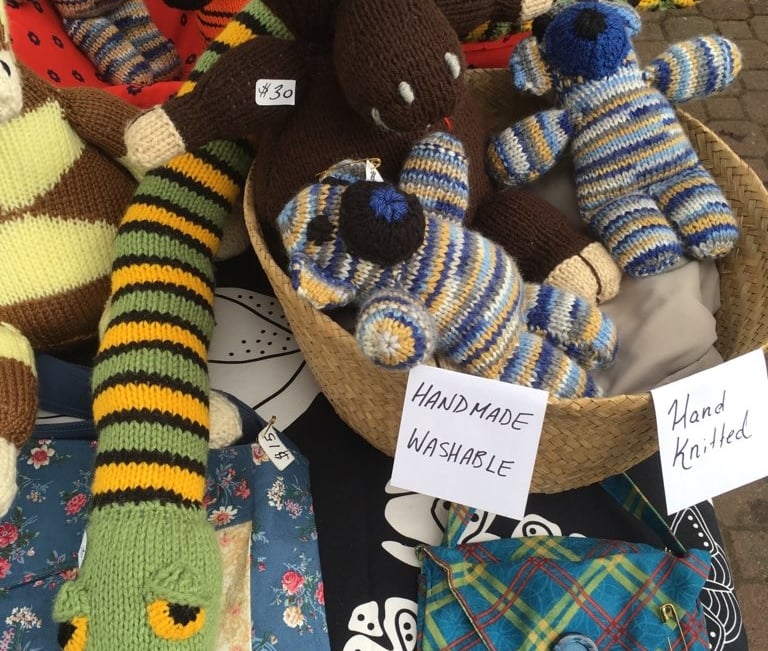 Hand made hats and scarves; wooden furnishings; gluten-free and vegan food