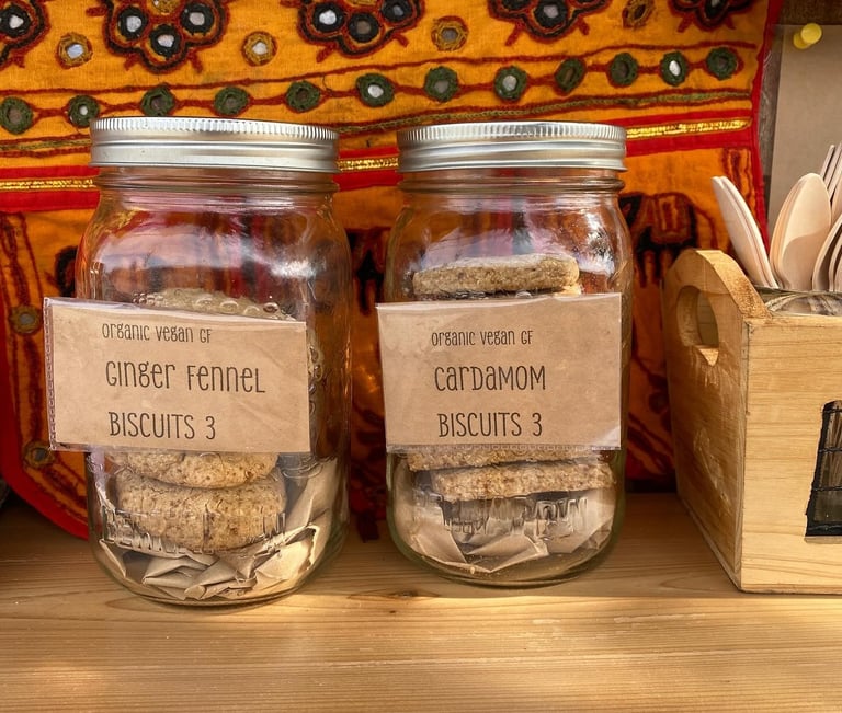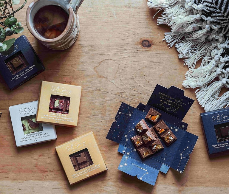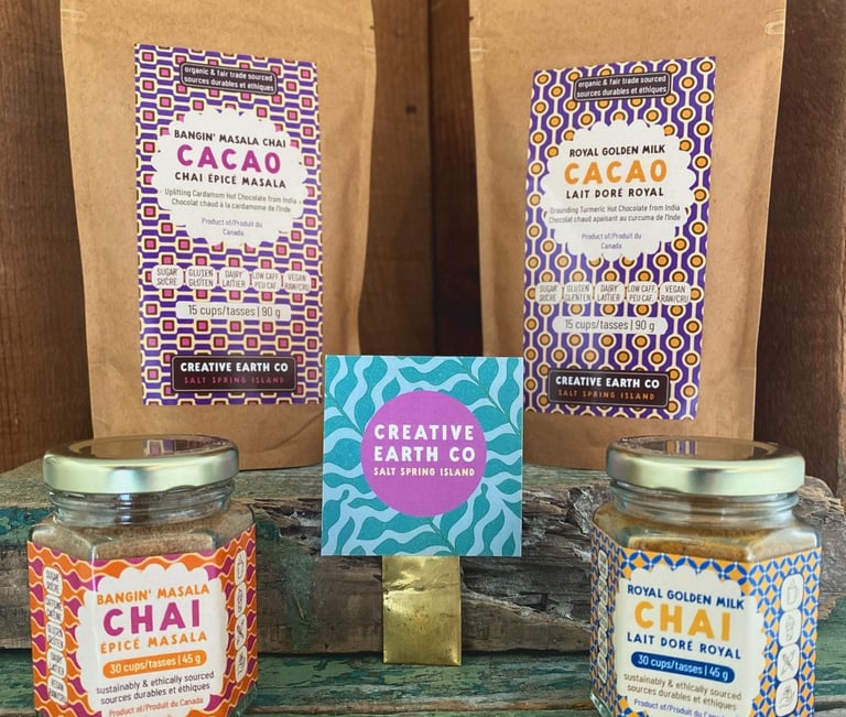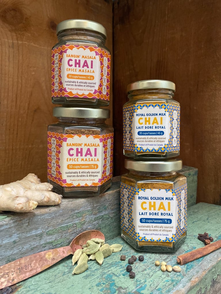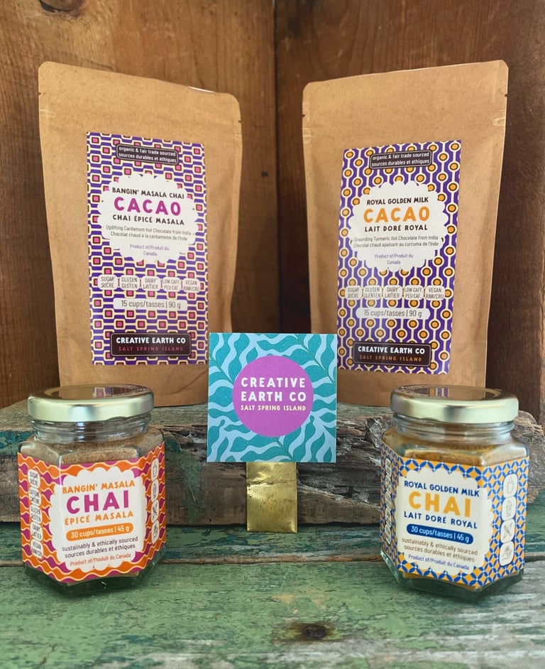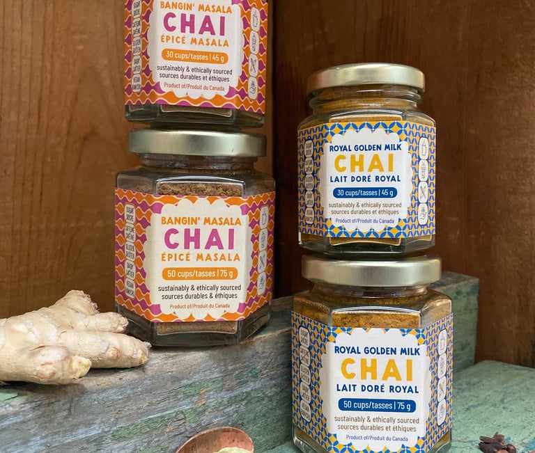 Instant steeping chai latte and cacao elixirs - caffeine and sugar free.