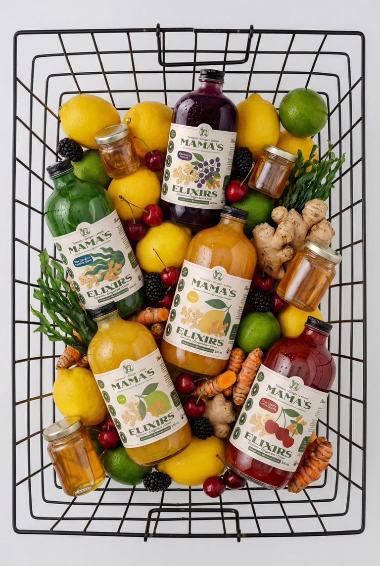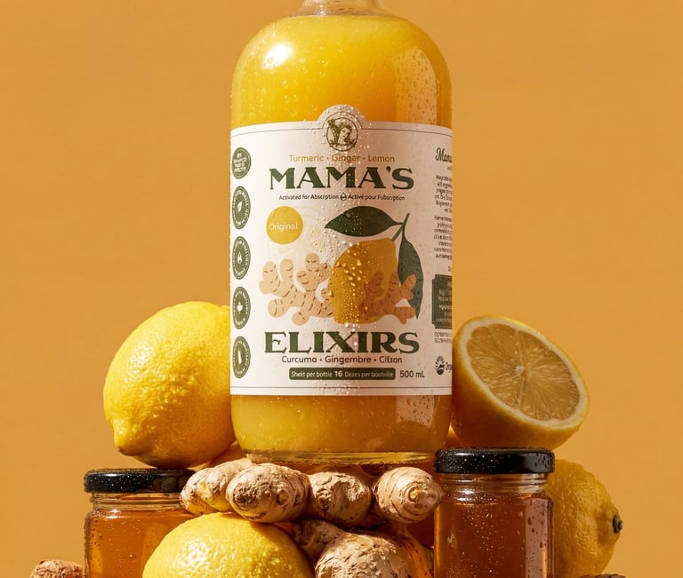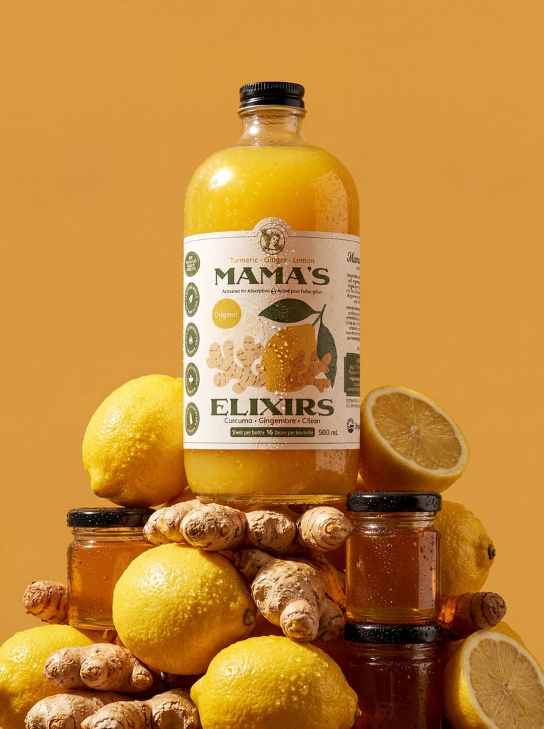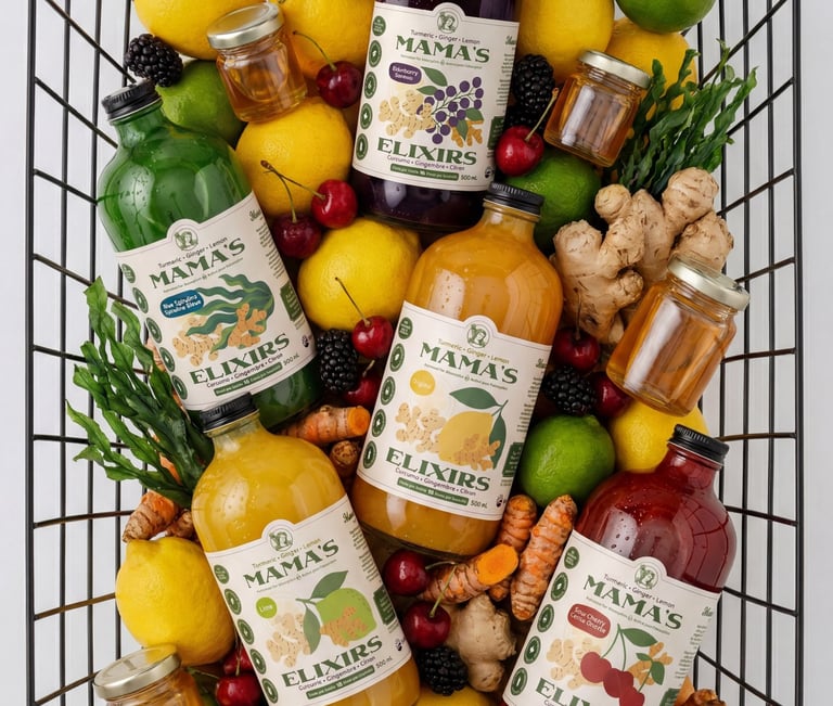 Multi-serving turmeric, ginger, and lemon based elixirs and single-serving superfood hydration canned drinks.
