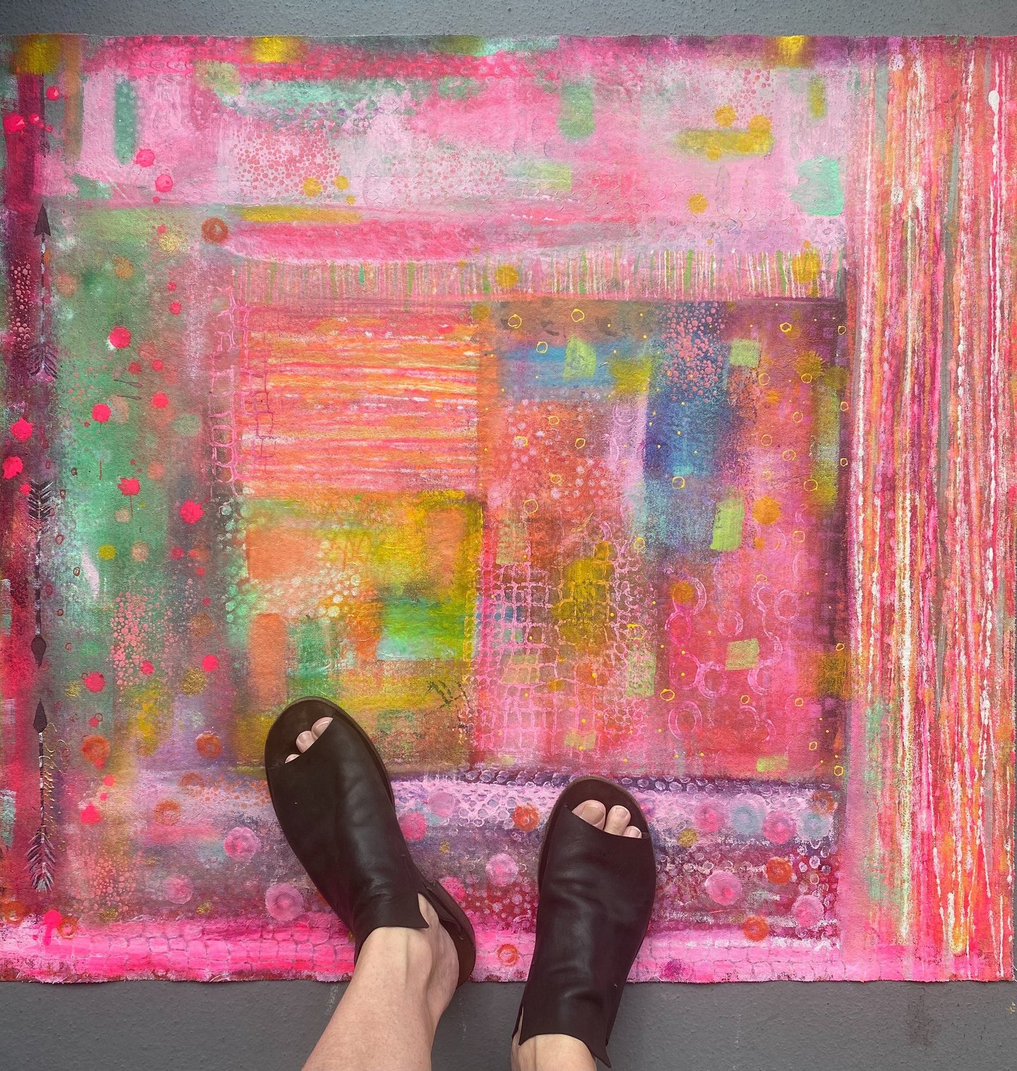 My process involves painting acrylic on canvas and sealing each piece with floor varnish. The finished product can be used indoors and outdoors, they are waterproof, UV protected, pet-friendly, stiletto sturdy, and can be washed with soap and water. She invites you to grace your space with her unique hand-painted floor art.